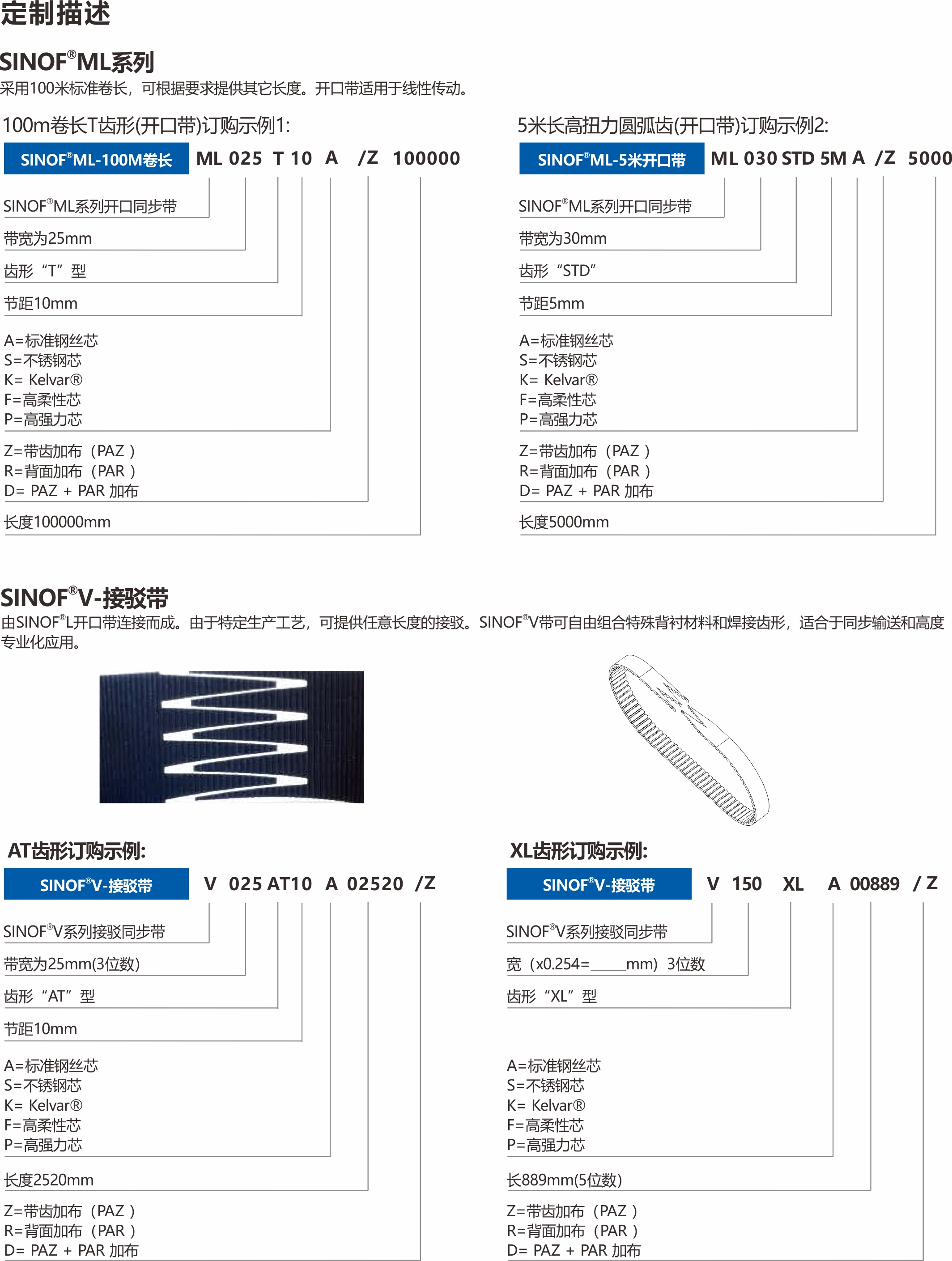 由開口帶接駁而成。采用特殊的生產工藝,可根據要求提供任意長度和寬度的接駁。由其高靈活性和獨特的定位精度,SINOF® V帶非常適合各種同步要求的輸送應用。