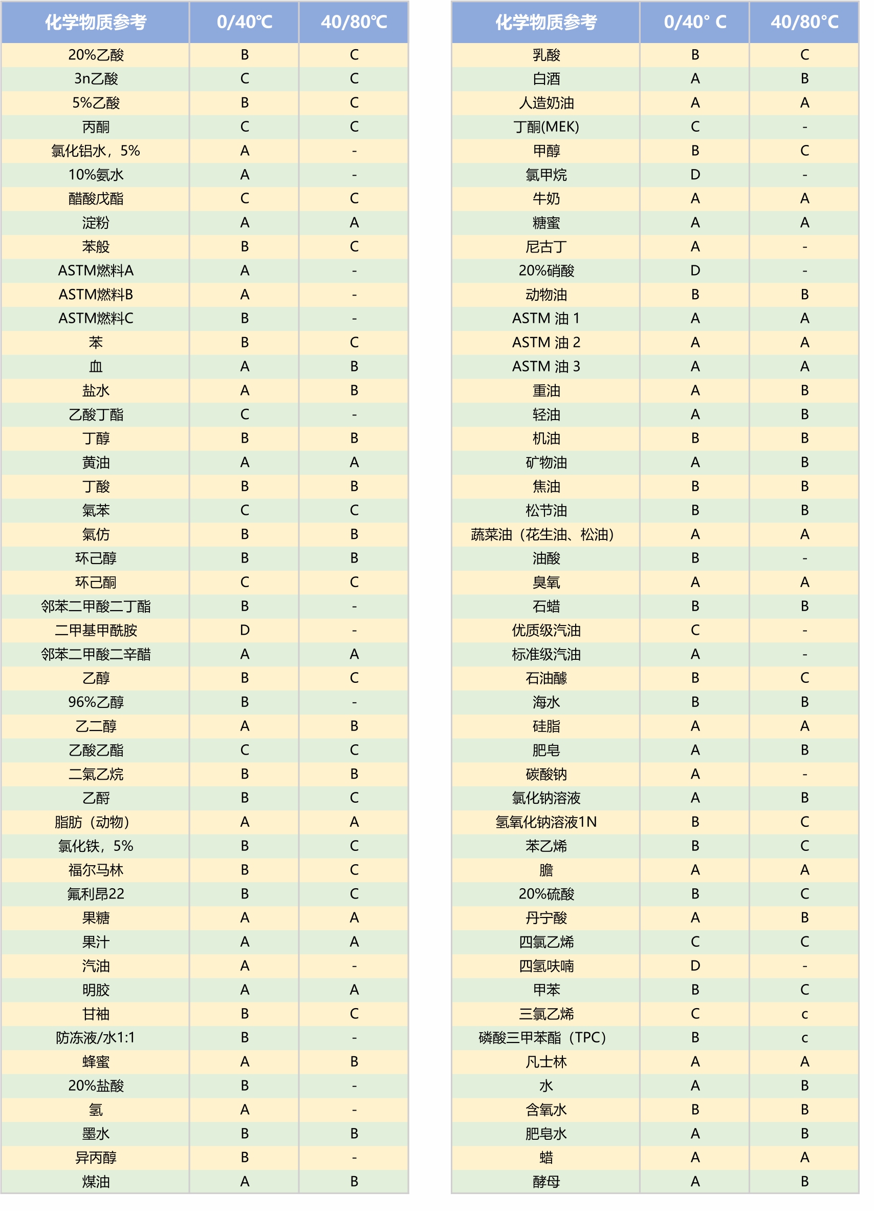 耐化學性:化學物質對聚氨酯的影響體現在多個方面。由于耐受性主要取決于化學品濃度與所處的溫度,因此提供的信息僅是一般參考。如需更多詳細信息,請聯系我們的技術部門。